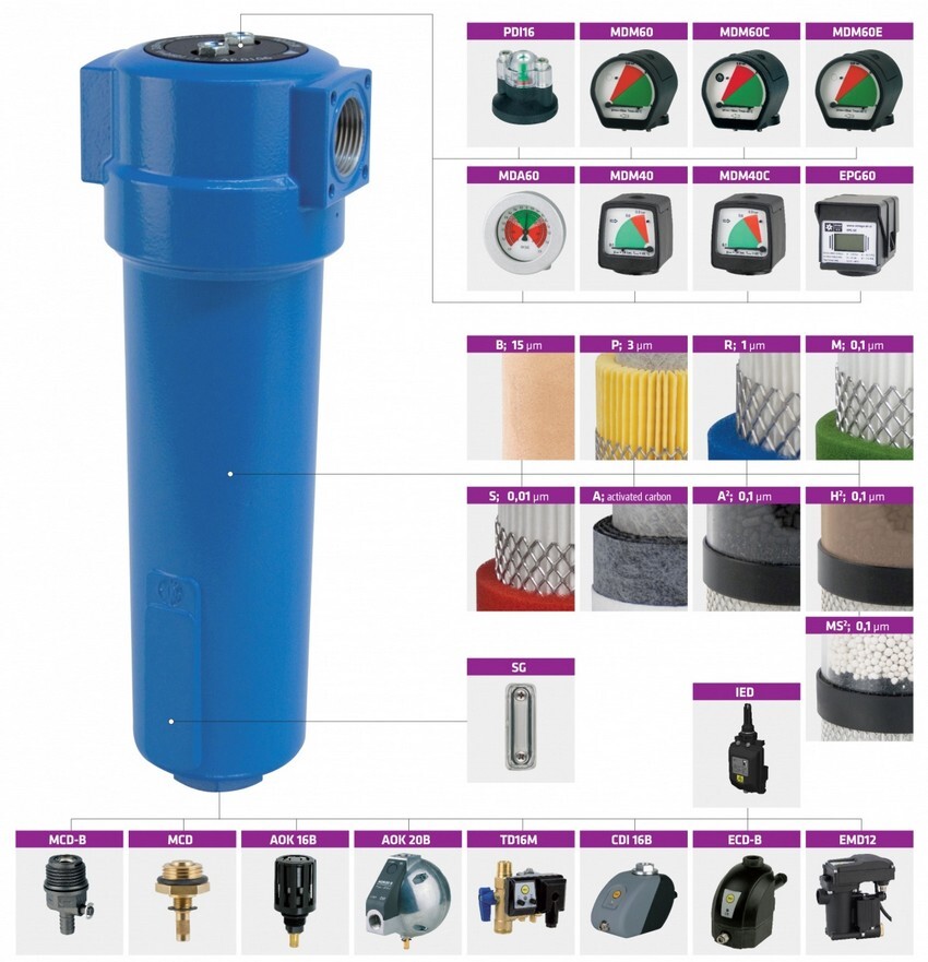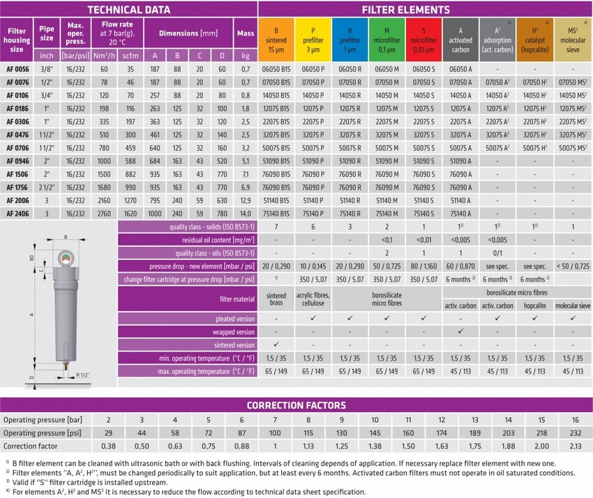 AF filter housings are designed for high eficient removal of solid particles, water, oil aerosols, hydrocarbons, odour and vapours from compressed air⁽¹⁾ systems. To meet the required compressed air quality appropriate filter element (B, P, R, M, S, A, A², H², MS²) must be installed into filter housing. ⁽¹⁾For any other technical gas please contact producer or your local distributor.